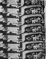 Следует также упомянуть о клеточном типе орнаментации тканей. Образцом этого типа является ткань из Астаны, обнаруженная вместе с документом 631 г. Орнамент её состоит из клеток с помещенными в них вертикальными рядами буйволов, львов и слонов с ездоками на спине (рис. 10). [43] Клеточный тип орнаментации на ханьских тканях не известен. Этот тип декора появился в Китае, вероятно, под западным, скорее всего под индийским влиянием и, судя по материалам из Нара, продолжал существовать в Китае до VIII в. [44]