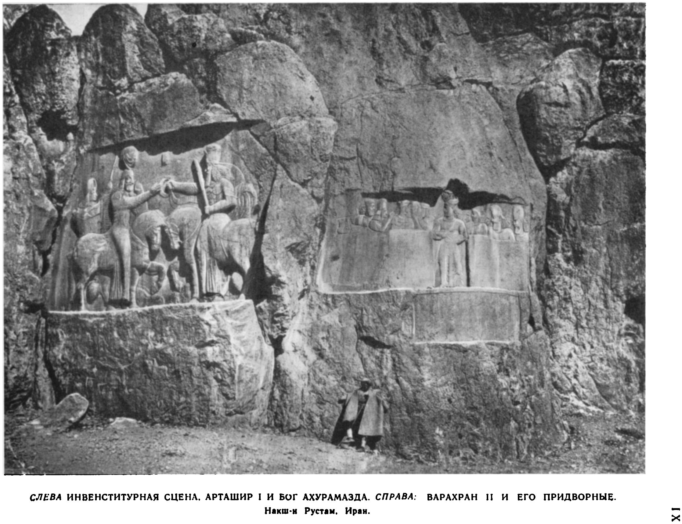 ^ IX. Слева: Инвенститурная [инвеститурная] сцена. Арташир I и бог Ахурамазда. Справа: Варахран II и его придворные. Накш-и Рустам. Иран.(Открыть Табл. IX в новом окне) |