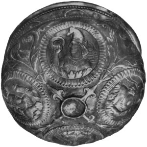 ^ XI. Серебряное блюдо с изображением наследника престола, охотящегося на медведей. Найдено в Красной Поляне.(Открыть Табл. XI в новом окне) |