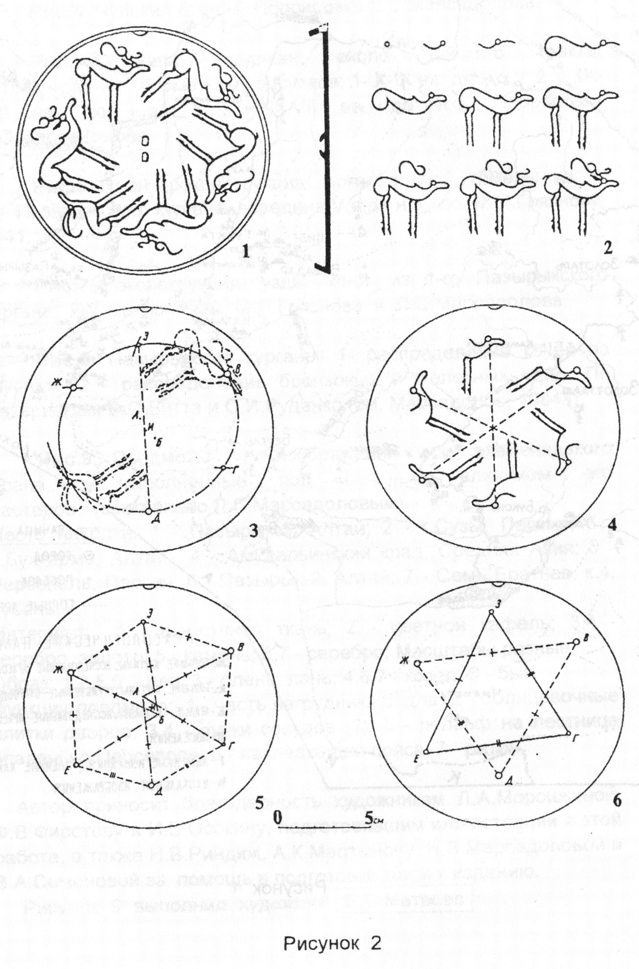 1 — вид зеркала и его разрез; 2 — последовательность рисования фигуры оленя; 3-6 — предполагаемая семантика разметки на этом зеркале (см. Марсадолов, 1982).
