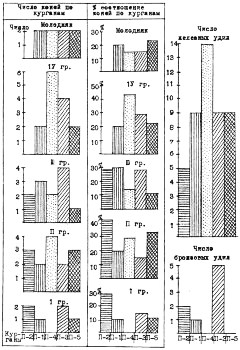 Пазырыкские курганы: 1 — распределение коней по группам; 2 — распределение бронзовых и железных удил. По материалам В.О. Витта и С.И. Руденко (см. Марсадолов, 1984а).