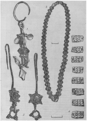 Рис. 1. Ювелирные изделия.1, 4 — серьга и золотые бляшки из погр. 3, к. 10; 2, 3 — серьги и ожерелье из погр. 2, к. 2; 1 — золото, сердолик, стекло; 2 — серебро с позолотой, стекло; 3 — шпинель, сердолик, стекло; 4 — золото. Размеры вещей даны в тексте. |