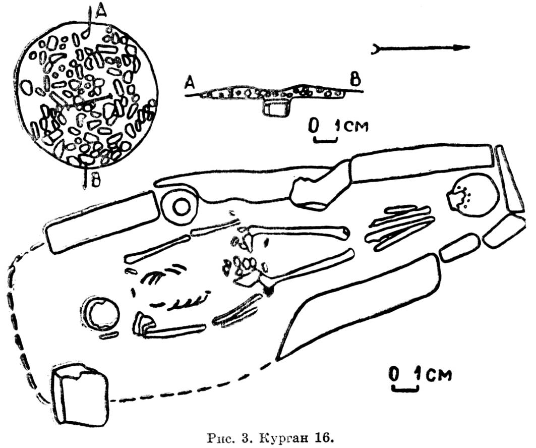 Курган 16 диаметром 6 м, насыпь каменная. В центре кургана — воронка длиной 2 м, шириной — 1,5 м и глубиной 0,3 м. На глубине 0,25 м от поверхности обнаружен завал из камней, который являлся перекрытием могильной ямы, по-видимому, потревоженной грабителями. Под камнями оконтурилась могильная яма, стенки которой обставлены каменными плитами или камнями, дно грунтовое. В северной части сохранилось перекрытие из положенных поперёк каменных плит. Высота ящика 0,35 м, длина 2 м, ширина 0,5 м (рис. 3, 1, 2). На дне ящика находился скелет человека в вытянутом положении, на спине, головой на ЮЮВ. Руки лежали вдоль туловища (рис. 3, 3). При расчистке скелета на тазовых костях, с левой стороны, в области пояса, найден железный ножичек с вычлененной рукояткой (табл. V, 5), в области грудных позвонков — четырёхгранное железное шило (табл. V, 3). В ногах стоял глиняный кувшин с шаровидным туловом, плоскодонный (рис. 4, 2), изготовленный ручной лепкой. В верхней части тулова — круглые отверстия для починки сосуда. Около локтевого су-