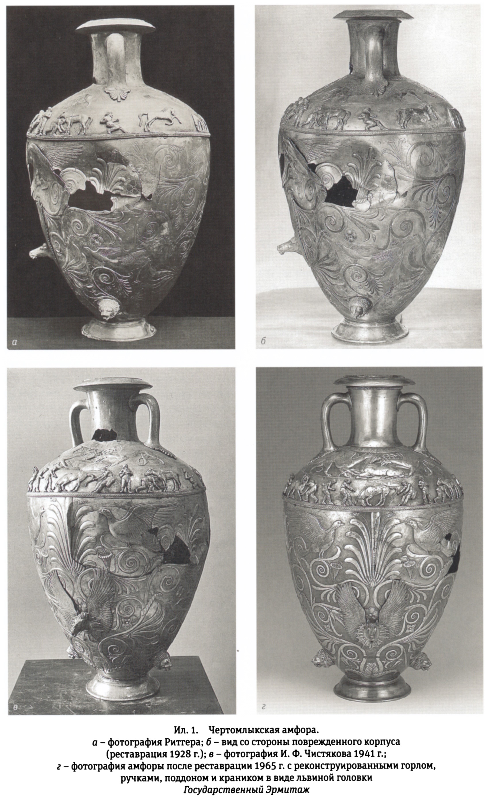 а — фотография Ритгера; б — вид со стороны повреждённого корпуса (реставрация 1928 г.); в — фотография И.Ф. Чистякова 1941 г.; г — фотография амфоры после реставрации 1965 г. с реконструированными горлом, ручками, поддоном и краником в виде львиной головки.