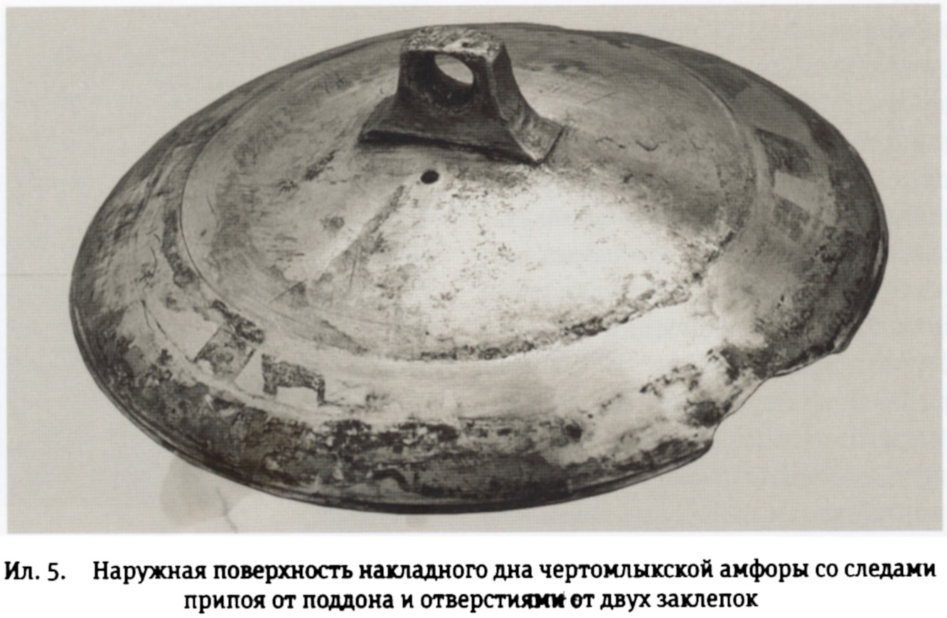 Ил. 5. Наружная поверхность накладного дна чертомлыкской амфоры со следами припоя от поддона и отверстиями от двух заклёпок.