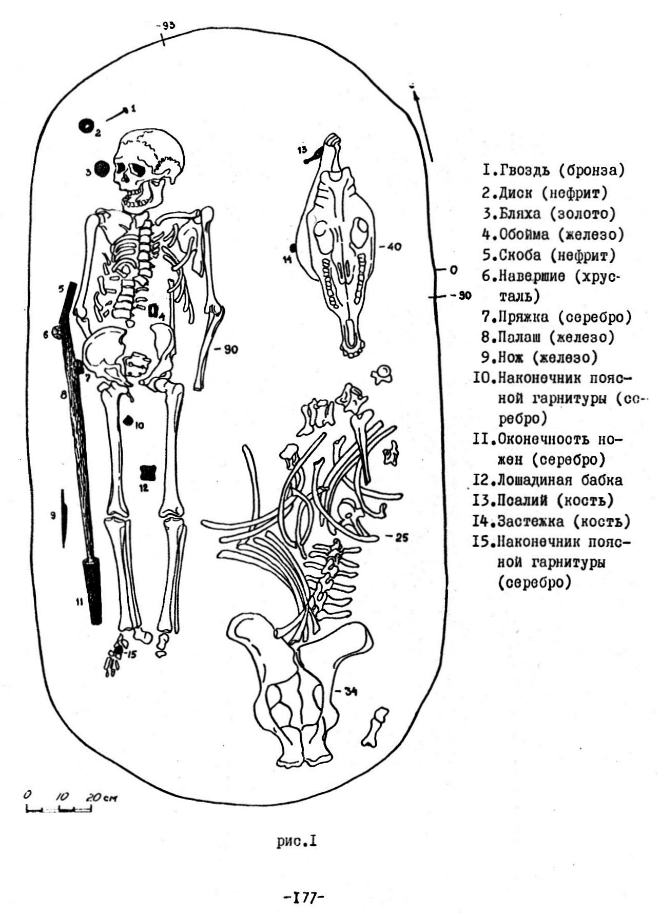Погребённый был снабжён довольно богатым инвентарём. Между западной стенкой могилы и погребённым лежал железный палаш (рис. 1‒ 8). Палаш очевидно был положен в ножнах, от которых сохранились массивная серебряная обкладка, украшающая нижнюю часть ножен (рис. 1‒ 11). В области рукоятки обнаружены серебрянная [серебряная] пряжка поясной гарнитуры (рис. 1‒ 7), хрустальный граненный [гранёный] шар с уплощенными противолежащими сторонами и с отверстием. Этот предмет, по всей видимости был навершием рукояти палаша (рис. 1‒ 6). Здесь же лежали нефритовая скоба для портупейного ремня (рис. 1‒ 5). Между западной стенкой могильной ямы и палашом обнаружен железный нож (рис. 1‒ 9). На поясе погребённого была найдена железная обойма — принадлежность пояса (рис. 1‒ 4). Два серебряных наконечника от поясной гарнитуры выявлены у правой ноги погребённого, у верхней части бедренной кости (рис. 1‒ 10), а другая на голеностопе (рис. 1‒ 15). Между ног покойника, почти на уровне колен, обнаружена лошадинная [лошадиная] бабка (рис. 1‒ 12). Между черепом и западной стенкой могилы найдены нефритовый диск с отверстием (рис. 1‒ 2), бронзовая бляха, также с отверстием (рис. 1‒ 3) и бронзовый гвоздь (рис. 1‒ 1). Скорее всего, перед нами ни что иное, как разобранное навершие рукоятки палаша.