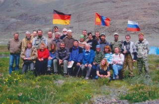 ^ Рис. 2. (стр. 56) Руководители российско-германско-монгольской экспедиции с Президентом Академии наук МНР на месте раскопок (слева-направо: профессор Д. Цэвээндорж, академик В.И. Молодин, академик Б. Чаадра, профессор Г. Парцингер).