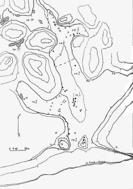 Могильное поле Аймырлыг - 2 исследовалось в течение 1972-1978 гг. отрядом Уральского государственного университета им. A.M. Горького под руководством Б.Б. Овчинниковой, работавшего в составе Саяно-Тувинской археологической экспедиции ЛОИА АН СССР (Овчинникова Б.Б. и др., 1975, с. 224 — 225). Памятник расположен в 10 км к юго-западу от поселка Старый Чаа-Холь (Улуг-Хемский район, Республика Тува), в межгорных котловинах на левом берегу реки Чаа-Холь, впадающей в Енисей. С целью планомерного изучения автор раскопок условно разделила территорию памятника на четыре группы курганов, находящихся в непосредственной близости друг от друга (рис. 2): группа I включала 56 курганов (вскрыто 18); группа II состоит из 28 сооружений (вскрыто 7); группа III содержала 45 насыпей — вскрыта полностью; группа IV — на её территории находится четыре больших насыпи, каждая из которых объединяет по несколько курганов. Данная группа раскопкам не подвергалась. В результате отметим, что полностью археологические раскопки были завершены лишь на группе III, материалы которой предлагаются к публикации.