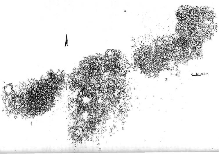 Рис. 3 План наземных сооружений «дружинного захоронения» могильника Аймырлыг 2: 1 — первая микрогруппа; 2 — вторая микрогруппа; 3 — третья микрогруппа.