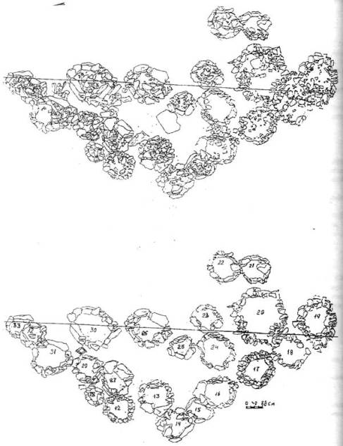 Следующее сооружение № 12 начинает условно выделенную на «дружинном кладбище» вторую микрогруппу. Цепочка курганов спускается к югу, и вытянута по линии ЗВ (рис. 3), она включает 22 сооружения (рис. 5). Нумерация объектов в этой микрогруппе продолжает предыдущие и дана в соответствии с вскрытием курганов.