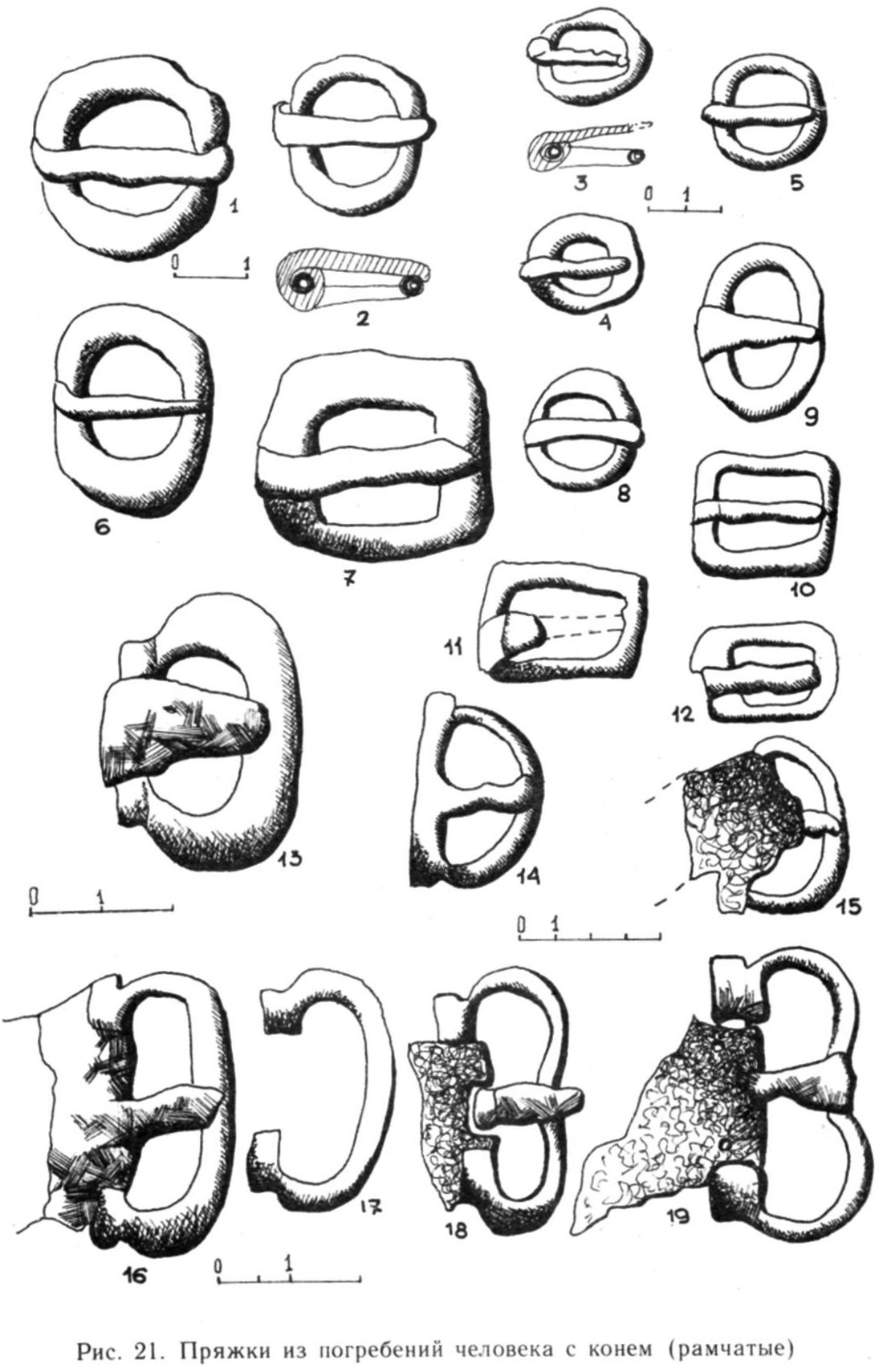 Отдел А1. Ремень соединяется с пряжкой при помощи оси-«приёмника», которая служит осью одновременно и для пластины-щитка, и для язычка, и для рамки. По остаткам можно заключить, что такие пряжки чаще всего были комбинированными: рамка изготовлялась из бронзы, а пластина из железа (табл. 1, рис. 21). Но так как в большинстве случаев последняя отсутствует, то данные пряжки включены нами в дополнительный отдел, в котором они выделены в типы лишь по форме рамки, без учёта щитка.