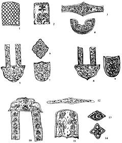 ребряной фигурной бляхой портальной формы, орнаментированной растительным узором: два вьющихся вверх побега, расположенные симметрично, образуют сердцевидную фигуру. В месте их схождения — два загнутых в разные стороны завитка. Другой конец стебля имеет вид гирлянды, поднимающейся вверх с симметричными листьями по бокам. На конце изображен трилистник с центральным листом в виде закрученного завитка (рис. 1: 8).
