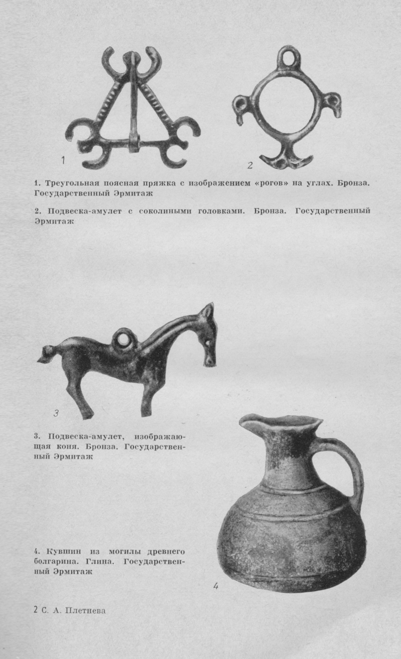 1. Треугольная поясная пряжка с изображением «рогов» на углах. Бронза. Государственный Эрмитаж.2. Подвеска-амулет с соколиными головками. Бронза. Государственный Эрмитаж.3. Подвеска-амулет, изображающая коня. Бронза. Государственный Эрмитаж.4. Кувшин из могилы древнего болгарина. Глина. Государственный Эрмитаж.