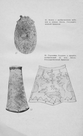 21. Бляха с изображением кабанов и птицы. Кость. Государственный Эрмитаж.22. Горлышко бурдюка и прорись изображений на нём. Кость. Государственный Эрмитаж.