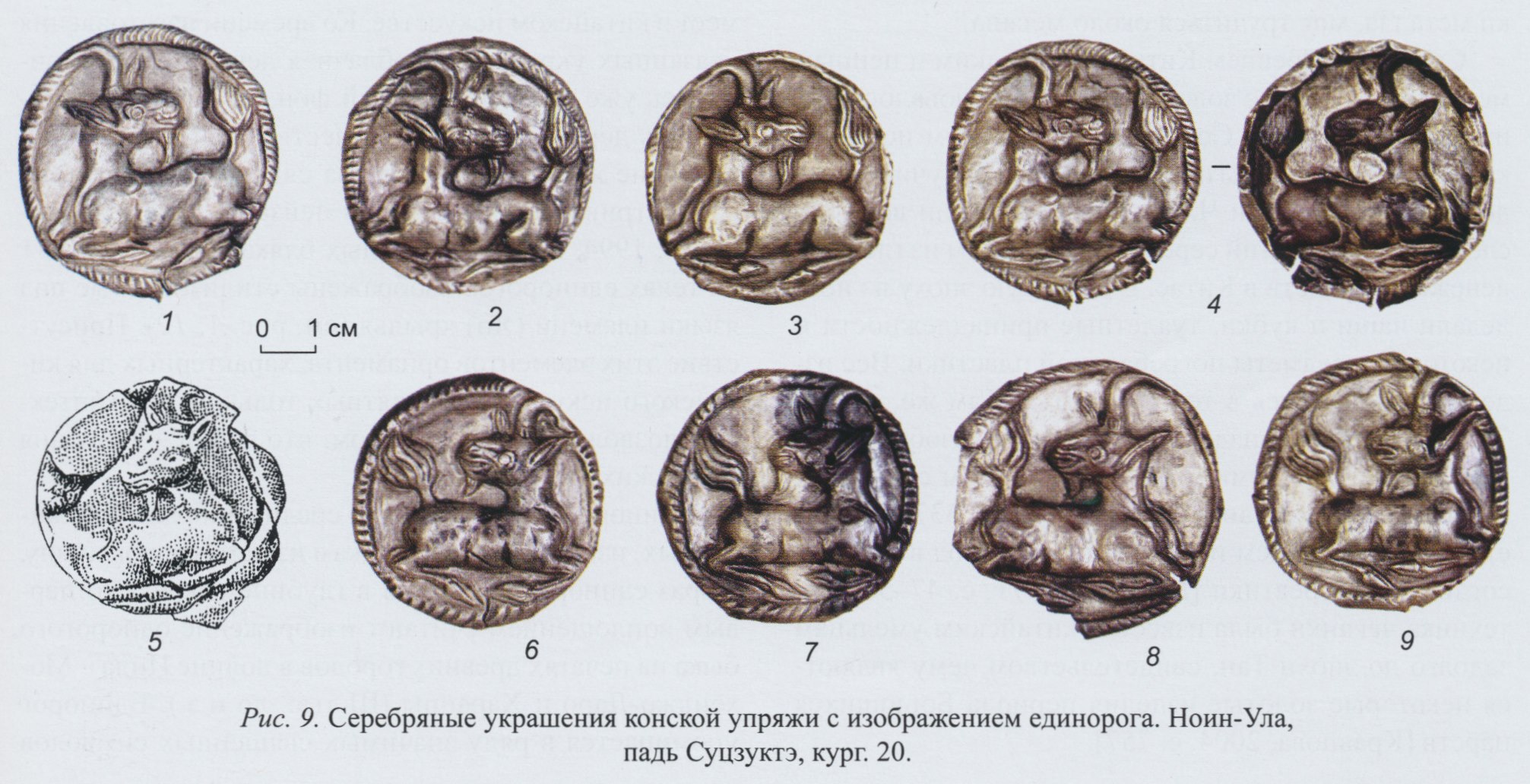 с изображением крылатых газелей находились в ханьской могиле №1 в д. Сюйцуньган уезда Ци пров. Хэнань (см. рис. 1, 8) [Краткий отчёт..., 2000, с. 42, рис. 11]. Двенадцать крупных серебряных инкрустированных блях с изображением, вероятно, единорога-хищника, зафиксировано при раскопках мог. 219 памятника Согамни в Наньшань (Северная Корея) (см. рис. 1, 4) [The ancient culture.., 2001, cat. 51]. Несколько таких предметов из случайных находок на территории Северного и Северо-Восточного Китая хранится в частных собраниях (см. рис. 1, 1-3). Это далеко не полный список известных сегодня металлических блях — украшений конской упряжи в форме тыквы-горлянки с изображениями фантастических животных, которые входят в китайский бестиарий (драконы, единороги, лошади-драконы, фениксы, олени). Многие изображения включают типично китайские элементы украшений в виде «облачных лент». Вещи, подобные найденным в кург. 20 в Ноин-Уле, пока не обнаружены западнее Монголии. Вероятно, их ареал максимально приближен к месту изготовления.