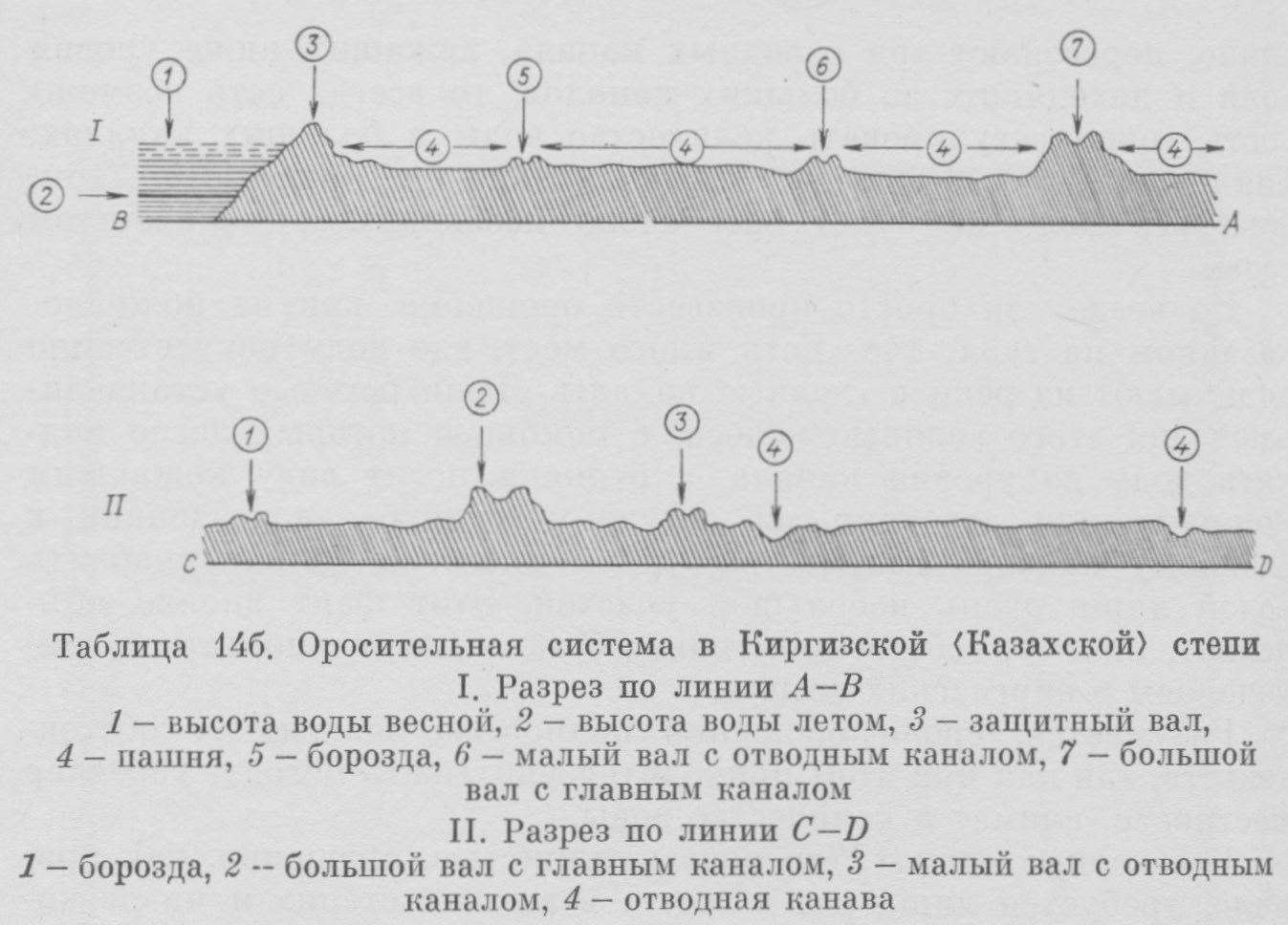 Таблица 14б [стр. 298]. ^ Оросительная система в Киргизской <Казахской> степи. I. Разрез по линии А-В. 1 — высота воды весной, 2 — высота воды летом, 3 — защитный вал, 4 — пашня, 5 — борозда, 6 — малый вал с отводным каналом, 7 — большой вал с главным каналом. II. Разрез по линии С-D. 1 — борозда, 2 — большой вал с главным каналом, 3 — малый вал с отводным каналом, 4 — отводная канава.