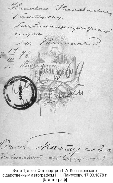 Фото 1, а и б. Фотопортрет Г.А. Колпаковского с дарственным автографом Н.Н. Пантусову. 17.03.1878 г.