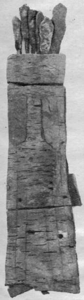Один из берестяных колчанов (рис. 13) сохранился лучше других. Он не имеет деревянного каркаса и состоит из двух кусков берёсты свёрнутых в виде плоских футляров, вложенных один в другой и плотно склеенных между собою. С наружной стороны вверху, как украшение, наклеены две кожаные полоски, а с обратной стороны, с тою же целью вдоль краев надрезаны две узкие полоски. В колчане помещалась связка стрел.