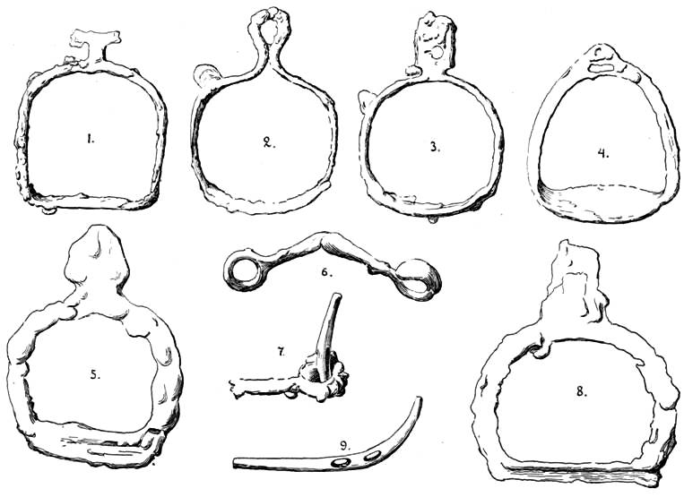 Любопытно отметить, что всадники изображены с опущенными ногами без стремян. Между тем при каждом седле, как правило, находится пара железных стремян нескольких типов (16, 1-5 и 8). Мы имеем или дугообразное стремя с прорезами для ремня и очень широким основанием, или почти круглые стремена с круглым или квадратным прорезом для ремня, с двумя ушками по верхнему краю и сравнительно узким основанием, или плоское, почти квадратное стремя, широкое или узкое с узеньким основанием. У стремян часто находятся литые бронзовые прямоугольные обоймы, которые надевались на ремень стремени, в нескольких сантиметрах от стремени, дабы последнее плотнее держалось и не скользило на ремне.