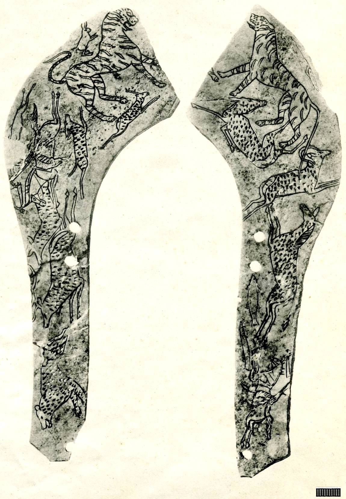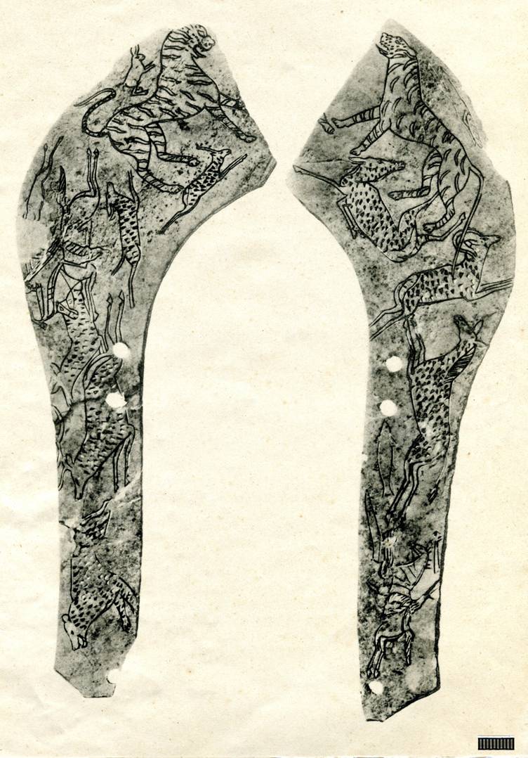 Гравировка, покрывающая всю поверхность костяной пластины передней луки седла (см. таблицу), представляет собою сложную и высоко художественную композицию, исполненную смелою и искусною рукою. За исключением двух центральных фигур тигров, все остальные изображены на летучем галопе, вполне реалистично, с глубоким знанием и пониманием формы. Особенно замечательны две фигуры всадников, стреляющих на полном карьере из луков, в одном случае в преследуемых оленей, самца и самку, в другом — в кулана.