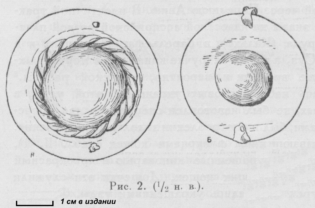 листком золота. Точно такие же бляхи были найдены и в кургане I. Изящнее оформлена деревянная, также круглая, налобная бляха с выпуклой центральной частью от другого уздечного набора (рис. 2, а). Выпуклая центральная её часть окаймлена кольцом верёвочного орнамента. И эта бляха в её выпуклой части вместе с кольцом покрыта листовым золотом.