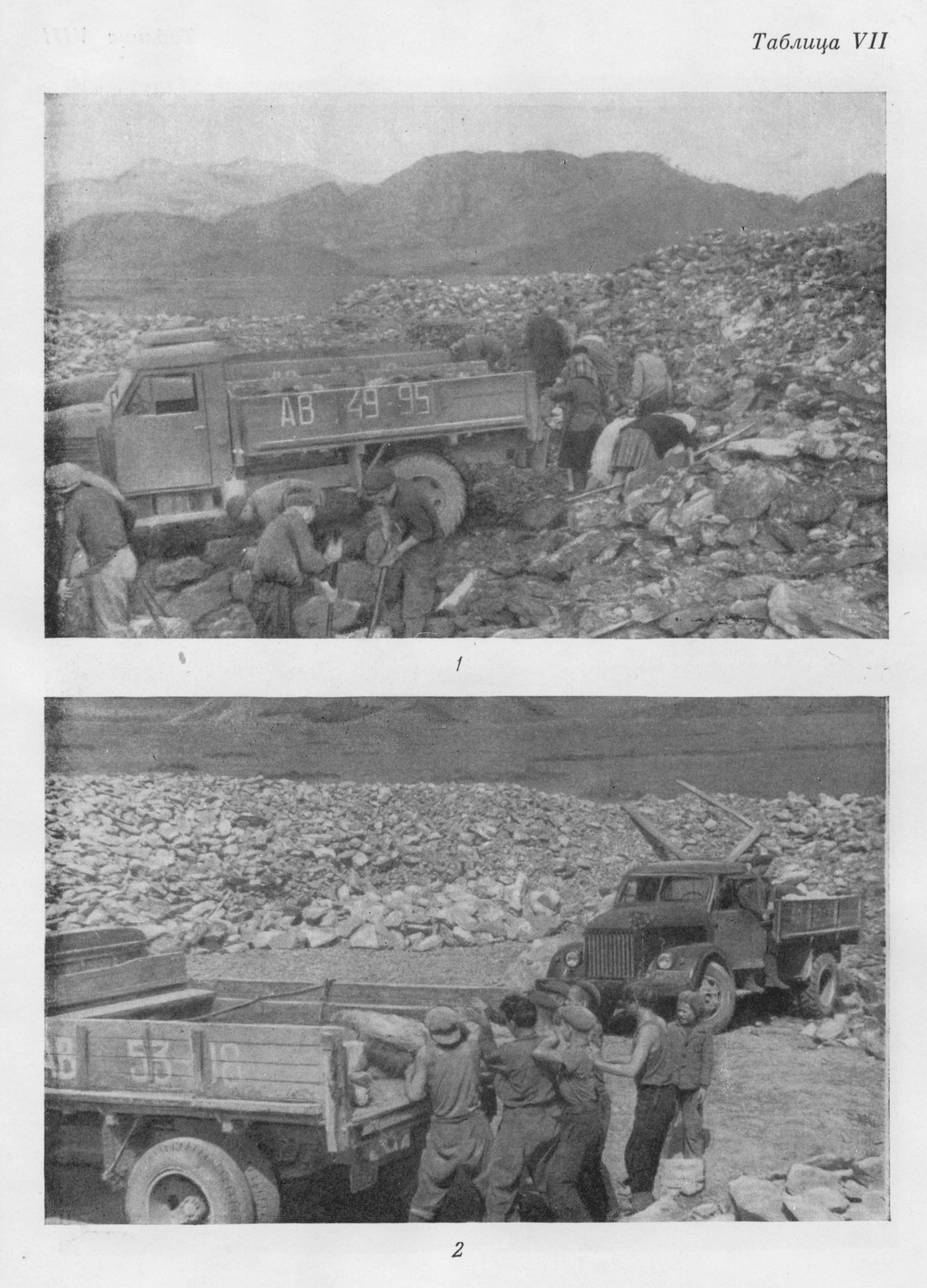 ^ Табл. VII. Первый Туэктинский курган. 1, 2 — погрузка на автомобиль камней наброски.