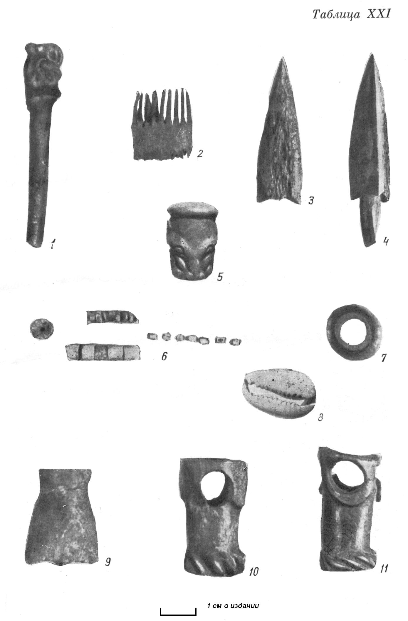 ^ Табл. XXI. 1 — костяная пластинка из кургана под Солонечным белком; 2 — часть костяного гребня из кургана у дер. Черновой; 3, 4 — роговые наконечники стрел из кургана у дер. Черновой; 5 — роговая пронизка в виде львиной головы из Катандинского кургана; 6 — бусы и бисер из кургана под Солонечным белком; 7 — роговая пронизка из кургана у дер. Черновой; 8 — раковина Cypreae moneta из Катандинского кургана; 9-11 — роговые пронизки из курганов под Солонечным белком и у дер. Черновой. Натур.вел.