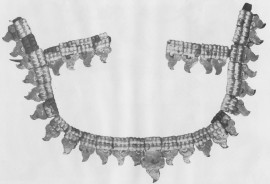 ^ Табл. XXXVI. Второй Башадарский курган. Кожаный седельный нагрудник с бронзовыми, покрытыми золотом украшениями. ½ натур.вел.