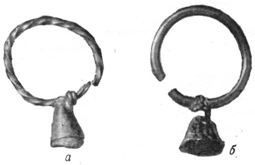 Наиболее простые серьги состоят из несомкнутого кольца и припаянного к нему колечка с пирамидками из четырёх шариков зерни (табл. XX, 11), из колец с припаянными к ним шариками, покрытыми зернью (табл. XX, 6 и 7), группой «кувшинчиков» (табл. XX, 8) или конических фигурок (табл. XXI, 5). Подобные серьги с коническим подвесками, со вставками бирюзы были найдены при раскопках погребений скифского времени в Сростинском [Сросткинском] районе Алтайского края. Одна из них (рис. 19, а) сделана из витой, квадратной в разрезе проволоки с припаянным внизу колпачком со вставкой из бирюзы (Эрм. № 1282-49. Вес 1.68 г.). Другая (рис. 19, б) — из круглой в сечении проволоки и коническим колпачком со вставкой бирюзы, покрытым снаружи псевдозернью (Эрм. № 1282-58. Вес 1.68 г.).