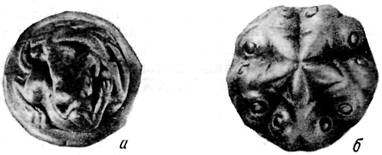 Подобные же украшения узды известны и из Минусинской котловины. На одном из них (рис. 24, а) представлен барс, впившийся в горло горного козла (Эрм. № СИ-247. Вес 34.5 г), на другом — пять орлиных головок (рис. 24, б), соприкасающихся клювами и представляющих собой пятилучевую звезду (Эрм. № 1124/19. Вес 22.95 г). Украшением узды служили, по всей вероятности, и подвески в виде клыков кабана (табл. XXIII, 6 и 14), так как подобные же вырезанные из дерева клыки неоднократно находились в горноалтайских курганах.