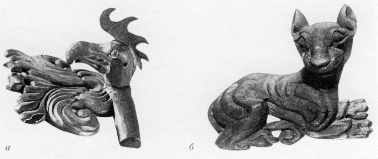 ![]() ^ 16. Вырезанные из дерева подвески узды: а — гриф. Первый Пазырыкский курган; б — котёнок. Четвёртый Пазырыкский курган.