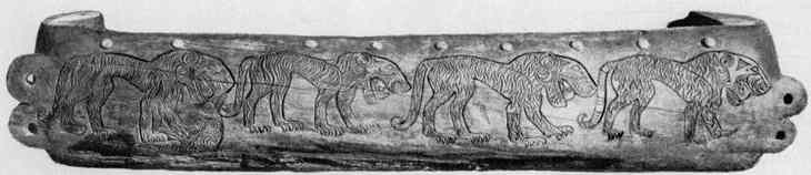 ![]() ^ 87. Сцены нападения тигра на парнокопытных : а — на лося; б — на горного барана; вырезанные из кожи украшения седельных подушек. Первый Пазырыкский курган.