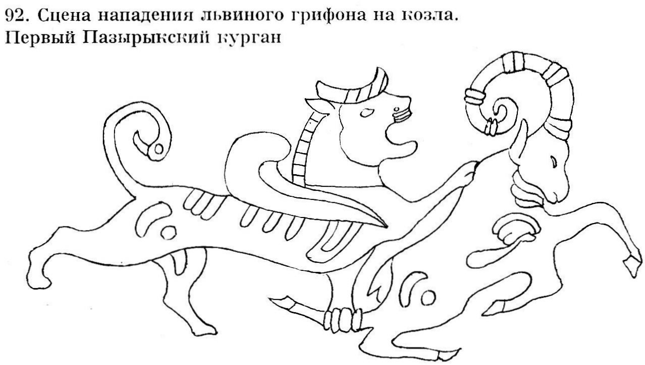 ![]() ^ 92. Сцена нападения львиного грифона на козла. Первый Пазырыкский курган.