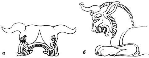 ![]() ^ 95. а — рогатые львиные головы. Ассирийский штандарт; б — рогатая львиная голова. Капитель дворца Ксеркса в Персеполе.