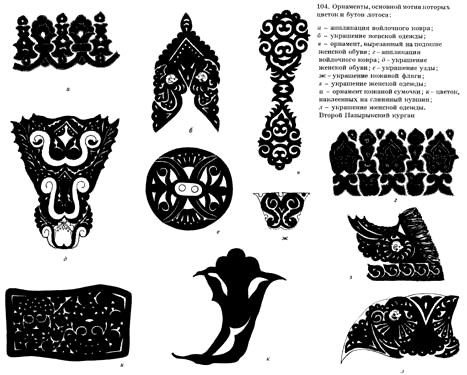 ![]() ^ 104. Орнаменты, основной мотив которых цветок и бутон лотоса. Второй Пазырыкский курган.