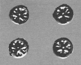IV.12. Ill. 1.Rosettes à huit pétales (cinq cent cinquante-cinq).Le décor estampé de ces bractées se compose d’une rosette dont le centre forme une saillie hémisphérique. Deux ouvertures sont percées de part et d’autre de l’objet, dans le rebord, pour permettre sa fixation.Dimensions: diamètre 1,3 cm; hauteur 0,15 cm.Poids: 86,0 g (au total).Etat de conservation: traces d’usure par endroits.