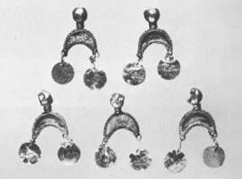 III.20. ^Pendeloques en forme de croissants (huit).L’exécution de ces bijoux a nécessité le recours à plusieurs procédés techniques. Les boules creuses de la partie supérieure ont été coulées en or; elles sont percés de part en part afin d’être suspendues. Un petit pied vertical les relie à l’élément coulé en forme de croissant concave, dont le pourtour est bordé de granulations. Ce croissant conserve, dans sa partie creusée quelques fragments d’une pâte dure sur certains exemplaires, de turquoise sur d’autres. Les cornes sont terminées par des anneaux de fixation dans lesquels sont passées des petites tiges d’or enroulées en spirale. Celles-ci retiennent à leur tour des petits disques mobiles.Dimensions: hauteur totale disques compris 3,5 cm; croissant 1,8×1,9 cm.Poids: 9,78 g.Etat de conservation: trois exemplaires ont perdu leurs disques; de nombreuses incrustations ont disparu.