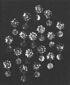 III.37. ^Grands cônes à rebord ornés d’un disque (quatre-vingts).Ces ornements obtenus par estampage ont un rebord en relief. Des anneaux de fixation sont soudés au sommet du cône, à l’intérieur et à l’extérieur. L’anneau extérieur supporte un disque suspendu par une attache.Dimensions moyennes: diamètre du cône 1,2 cm; hauteur anneau compris 0,8 cm; diamètre du disque 1,0 cm.Poids: 1,6 g (par unité); 70,0 g (au total).Etat de conservation: déformations partielles.