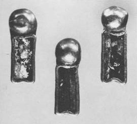 III.55. ^Plaquettes rectangulaires à tête ronde (trois).Coulées en forme de rectangle allongé, ces bractées sont incrustées d’une pâte noire. Une de leurs extrémités est surmontée d’une tête creuse hémisphérique; l’autre se termine par deux pointes. Quatre petits tubes de fixation sont soudés au revers de chaque plaquette.Dimensions: 1,6×0,5×0,3 cm.Poids: 2,94 g (au total).Etat de conservation: la pâte incrustée a presqu’entièrement disparu.