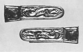 IV.4. Ill. 98. ^Plaques ornées d’une panthère (deux).Ces longues plaques coulées en or ont une extrémité arrondie légèrement rétrécie. L’autre bout, trapézoïde, est creux et contient une petite tige transversale de fixation. Le revers des plaques est lisse. Le décor de l’avers, en relief, représente un fauve guettant une proie. Il s’agit probablement d’une panthère dolichocéphale qui a les oreilles couchées et la gueule ouverte. Les membres antérieurs du félin sont tendus en avant et se placent sous sa tête. Les postérieurs sont retournés vers le haut dans une position peu naturelle. La queue est plaquée sous le ventre. La partie la plus large de la plaque se termine sur ses deux faces par une cavité carrée dans laquelle est enchâssée une autre plaque carrée. Cette dernière recouvre en partie la tige de fixation mentionnée ci-dessus.Dimensions (de chacune des plaques): longueur 4,0 cm; largeur des extrémités 1,2 et 0,8 cm.Poids: 10,35 et 14,47 g.Etat de conservation: usure bien visible sur la face ornée.Bibliographie: S. Roudenko, Culture des peuples de l’Altaï à l’époque scythe, Moscou — Leningrad, 1953, pl. IV [LIV], Nos 8 et 9 (en russe).