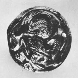 IV.5. Ill. 148. ^Phalère représentant un fauve mordant sa queue.Cette plaque ronde, bombée, a été coulée en or. Elle est munie d’une tige de fixation transversale, de section plate, qui contient encore quelques fragments de cuir bien conservé. Une créature fantastique ailée enroulée sur elle-même et mordant sa propre queue est représentée en haut relief. Les yeux pleins de rage du fauve sont exorbités, sa gueule largement ouverte, son gros nez aux naseaux dilatés est retroussé. Deux pattes griffues dépassent de l’encolure. Une aile fortement arquée aux rémiges disjoints, incrustée à la base d’une turquoise, prend naissance sur l’échiné velue de l’animal. Le corps allongé est enroulé. La queue est plaquée entre les postérieurs et la bête tient son extrémité dans sa gueule.Dimensions: diamètre 2,6 cm; hauteur 1,2 cm.Poids: 7,65 g.Etat de conservation: traces d’usure très visibles.Bibliographie: S. Roudenko, La Collection Sibérienne de Pierre Ier, in: Bulletin de l’Institut d’Archéologie, Moscou — Leningrad, 1962, pl. XXIII, Nos 23-25 (en russe).