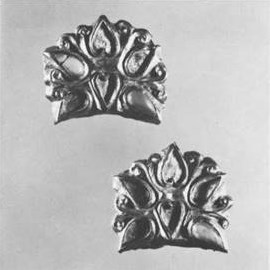IV.22. Ill. 37. ^Plaquettes en forme de quintefeuilles (deux).Coulées en or, ces bractées comportent des cavités en forme de cœurs et d’amandes, dans lesquelles sont serties des turquoises. Deux cœurs opposés ornent le centre. Ils sont flanqués de deux paires d’«amandes» séparées par des volutes doubles. Trois longues attaches de fixation sont soudées au revers de chaque plaquette.Dimensions: 2,5×2,7 cm.Poids: 16,0 g (au total).Etat de conservation: légères traces d’usure.