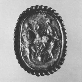 IV.27. Ill. 71. ^Plaque ornée d’une intaille.Cette bractée ovale est agrémentée sur son pourtour de fines granulations. Au centre, une intaille gravée sur une pâte de verre marron sur le dessus et blanche à l’intérieur, représente trois personnages. La scène a pour sujet des Héraclides tirant au sort (voir description p. 45). Un petit tube de fixation soudé au revers, sur la monture, permettait de coudre l’objet sur le vêtement ou de l’accrocher par un fin cordon.Dimensions: l,8×l,3×0,6 cm.Poids: 2,6 g.Etat de conservation: forte irisation.Bibliographie: O. Neverov, Les Gemmes italiques dans les nécropoles des villes situées au nord du Pont-Euxin, in: Pages de l’histoire des côtes septentrionales de la mer Noire, Leningrad, 1979, ill. 5 (en russe).
