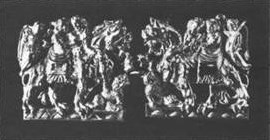 IV.35. Ill. 123. ^Plaque ornée d’une panthère déchirant une antilope.Coulée en forme d’écusson, cette plaque est décorée d’une scène en relief représentant la préhension d’un animal par un autre (voir description p. 44). Le revers de l’objet est pourvu de cinq crochets. Deux trous percés dans les angles à la base de la plaque complétaient sa fixation.Dimensions: 4,7×3,6×0,5 cm.Poids: 18,6 g.Etat de conservation: bon.Bibliographie: M. Artamonov, Trésors des kourganes Scythes, Prague, 1966, pl. 116 (en russe).