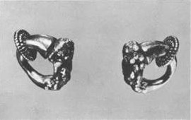 III.54. ^Boucles rondes (deux).Coulées en or, elles sont munies sur le bord d’un ardillon fongiforme.Dimensions: diamètre 1,9 cm; épaisseur de la partie la plus large 0,4 cm; épaisseur de la partieétroite, usée 0,2 cm; hauteur de l’ardillon et de l’anneau 0,9 cm.Poids: 20,87 g (au total).Etat de conservation: les parties plus étroites des anneaux sont très usées.