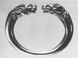 II.4. Ill. 105, 107. ^Bracelets ornés d’antilopes (deux).Coulés en or, de section ovale, aux bouts non fermés. Les extrémités se présentent sous forme d’antilopes au corps étiré par une course effrénée. Dans les coins de leurs grands yeux en amande, bombés et d’une taille exagérément importante, de petites incrustations de turquoise évoquent la cornée. Les pupilles sont figurées par des boules de cornaline d’un jaune translucide. Les oreilles en forme de pétales et les cornes recourbées des animaux sont incrustées de turquoises bombées, polies avec le plus grand soin. Leur museau est collé à leurs pattes antérieures, légèrement fléchies et vivement portées en avant. Ces dernières se terminent par des sabots incrustés de turquoises en forme d’amandes. Les sabots sont mis en relief par des cavités spécialement ménagées à leur intention. Les paturons pointus sont modelés avec précision. Les genoux fléchis avec souplesse sont représentés par des plis semi-ovales au relief peu marqué. Le bas des pattes est souligné par des hachures obliques figurant des poils. Une queue courte et large, marquée à sa base par des hachures en V qui remontent le long de l’échiné et se terminent à la base de cornes, est placée entre les pattes des antilopes. La musculature des animaux tendus par l’effort de la course est soulignée par de grosses turquoises serties à la naissance des pattes.Dimensions: 8,5×6,3 cm.Poids: 254,37 et 253,13 g.Etat de conservation: traces d’usure très visibles.Bibliographie: S. Roudenko, La Collection Sibérienne de Pierre Ier, in: Bulletin de l’Institut d’Archéologie, Moscou — Leningrad, 1962, pl. IX, Nos 4-5 (en russe).