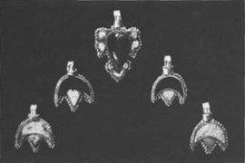 III.57. ^Embouts avec bélière de suspension (dix-sept).Tous coulés en or, ils ont des formes très diverses: ovale, arrondie, rhombique et triangulaire. Quelques rares exemplaires ont conservé des pierres enchâssées. On remarque parmi elles une pierre violet pâle translucide rappelant une améthyste ou un grenat. Presque toutes ces montures sont usées du fait de frottements répétés. On notera une douille assez grande au bord en dents de scie, qui contient une pierre blanche malléable percée d’une ouverture transversale comblée par un éclat de la même pierre.Dimensions et poids variés.Etat de conservation: traces d’usure très visibles.