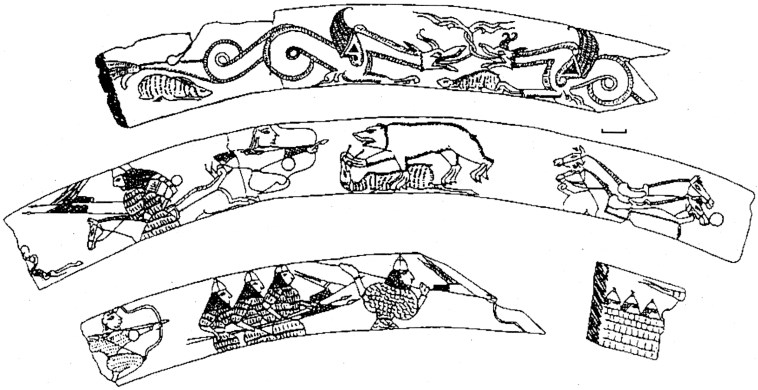 Раннесредневековые гравировки, о которых в основном пойдёт речь в настоящей статье, изучены ещё в меньшей степени, чем каменные изваяния. К числу самых ярких находок последних лет бесспорно относятся костяные пластины с великолепными изображениями, обнаруженные в 1992 г. Р.С. Багаутдиновым в кургане №1 Шиловского могильника в Ульяновской области (полную публикацию материалов см.: Багаутдинов, Богачёв, Зубов, 1998, с. 27-31, 104-109 и сл.). Датировка данного комплекса определяется достаточно точно по находкам золотых византийских монет Ираклия (годы правления 610-641 гг.), датирующих погребение с костяными пластинами не ранее указанного времени и не позднее середины VII в.