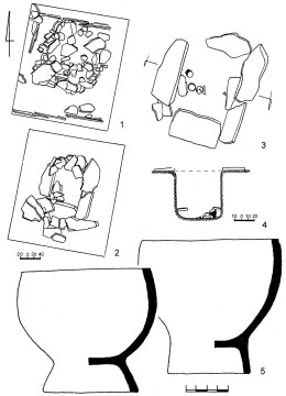 Погребение тесинского этапа: 1-3 — планы ограды и погребения; 4 — разрез; 5 — керамика.