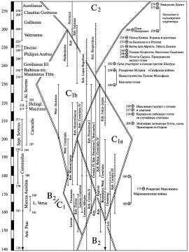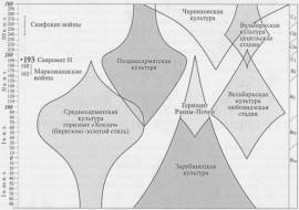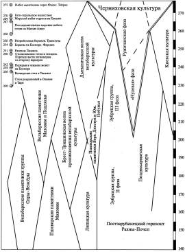 ^ Рис. 28. [Стр. 101] Хронологическое положение ряда археологических явлений Восточной Европы и синхронные исторические события.